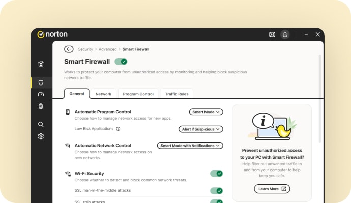 Bei den meisten Computern ist eine integrierte Firewall vorhanden, etwa die Firewall von Windows Defender oder macOS. Die Intelligente Firewall von Norton ergänzt dies um stärkeren, bidirektionalen Schutz, der sowohl ein- als auch ausgehende Verbindungen überwacht und dabei verdächtige Apps blockiert und zur Abwehr von Cyberbedrohungen beiträgt, die integrierte Firewalls möglicherweise nicht erkennen.